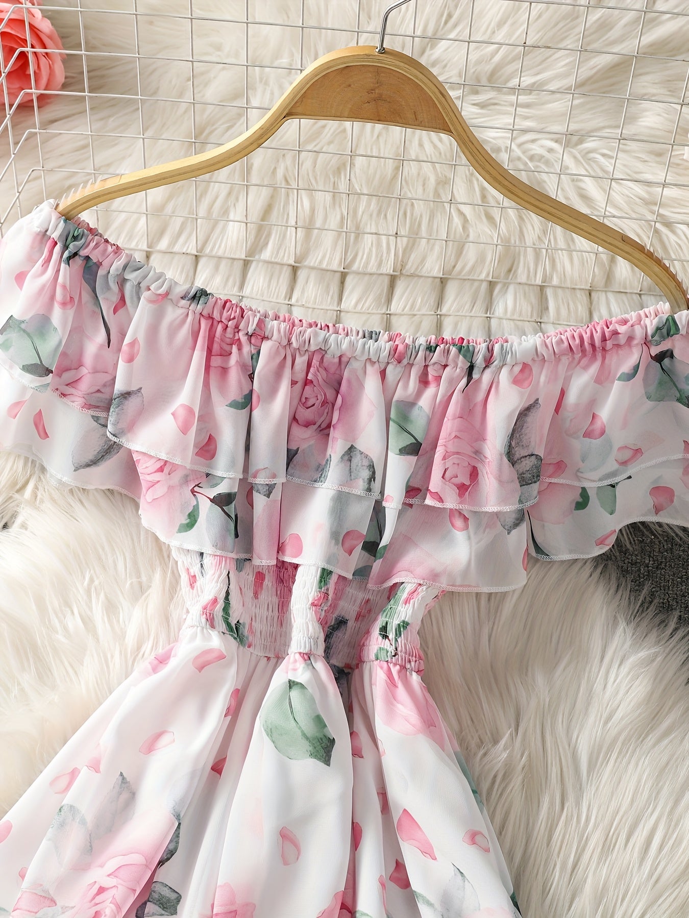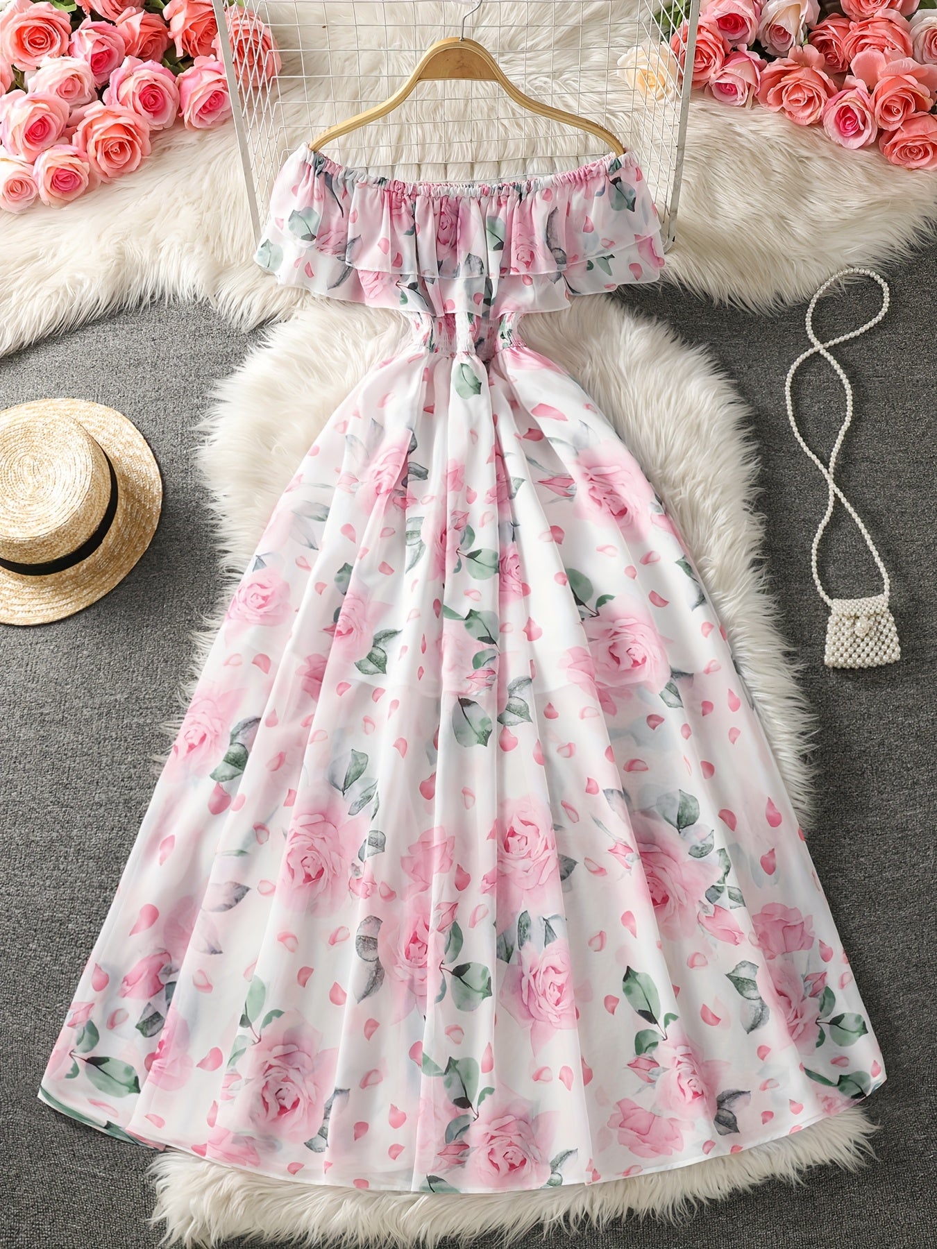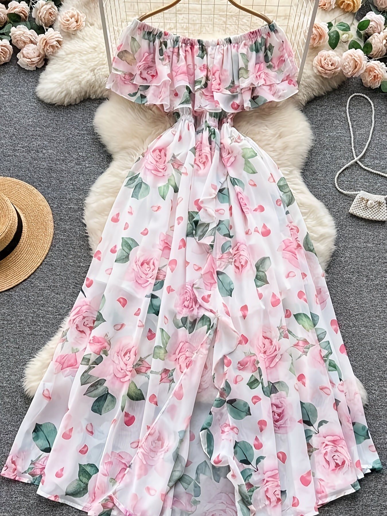 Elegant Women's Floral Off-Shoulder Dress – Ruffled Hem, Sleeveless.